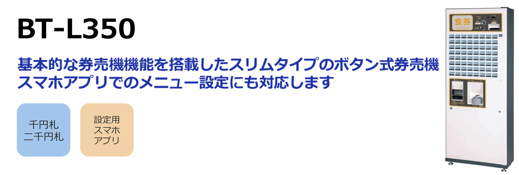 - 券売機レンタル可能機種のご案内 5月15日現在レンタル可能券売機は下記の通りです。 NECマグナスコミュニケーションズ株式会社製 高額紙幣対応券売機:BT-e212 3台 新500円硬貨対応 高額紙幣対応券売機:BT-L252 2台 新500円硬貨対応 低額紙幣対応券売機:BT-L250 2台 新500円硬貨対応 長期短期レンタル可能です!お見積り依頼はお問合せからお願い致します。
